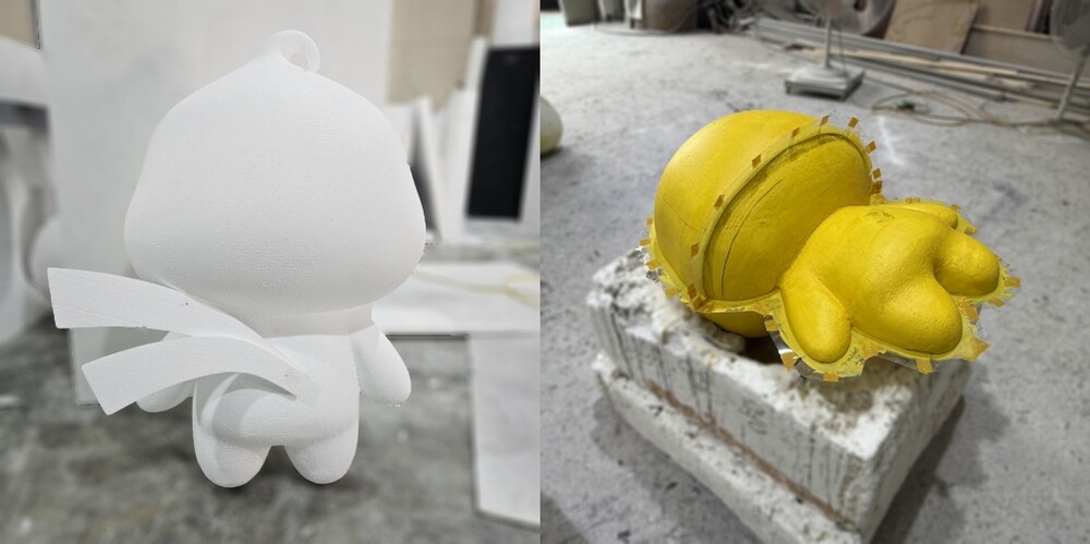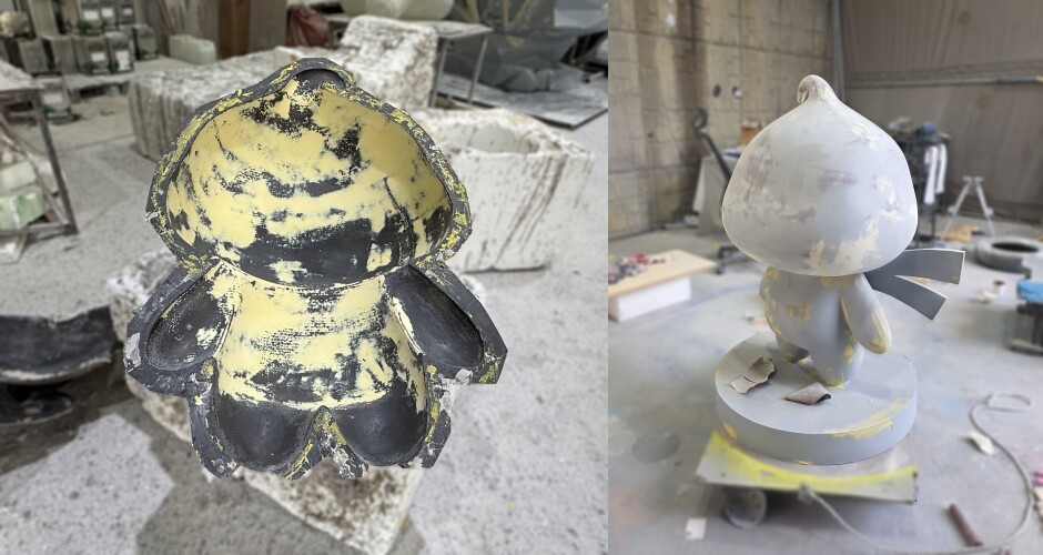 디자인 시안 검토 후 완성된 방울이 공공기관 조형물은 조각용 스티로폼으로 원형 조각을 진행했습니다. 마스코트의 입체감과 표정 디테일을 살리기 위해 섬세한 수작업으로 형태를 다듬었으며, 이후 몰드 제작을 위한 규산 도포 작업을 실시했습니다. 이 과정은 원형 변형을 방지하고 성형 시 매끄럽게 분리되도록 돕는 단계로, 내부에는 각파이프를 보강해 구조적 안정성을 높였습니다. 이렇게 완성된 몰드를 기반으로 FRP 성형을 진행해 최종 마스코트 조형물의 형태를 완성했습니다.