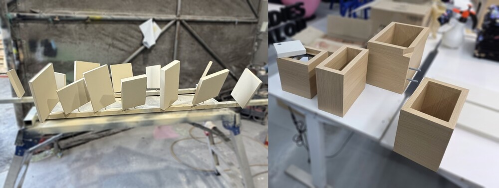 프라이머 도포면이 완전히 건조되자, 조형물에 색상을 입히는 본 도장 작업이 시작되었습니다. 도료의 뭉침이나 흘러내림을 방지하기 위해 여러 층으로 나누어 분사하는 방식으로 매끄럽게 마감했습니다. 도색 작업이 완료된 후, 디자인 시안에 맞춘 나무결 패턴을 정밀하게 구현하고자 시트지 부착 작업을 진행했습니다. 모든 디테일이 완성된 후, 표면을 보호하기 위한 투명 클리어 코팅제를 입히는 것으로 전체 제작 공정을 마무리했습니다.