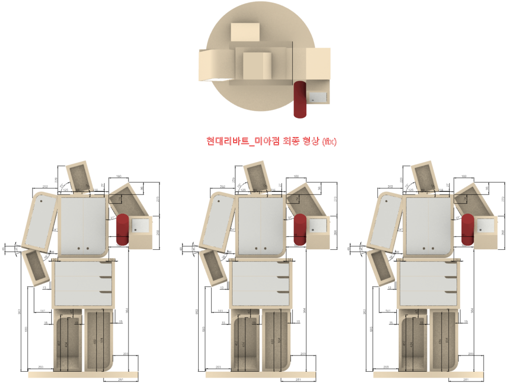 백화점 매장에 비치된 대형 FRP 조형물은 관람객의 시선을 사로잡을 수 있도록 총 높이 약 1,700mm로 제작되었습니다. 이 백화점 조형물의 가장 큰 특징은 다양한 형태의 수납함들로 구성된 캐릭터 외형입니다. 이는 리바트 가구 브랜드의 아이덴티티를 효과적으로 부각하며, 실내 공간에서도 멀리서 한눈에 띌 수 있는 시각적 임팩트를 제공하도록 완성되었습니다.