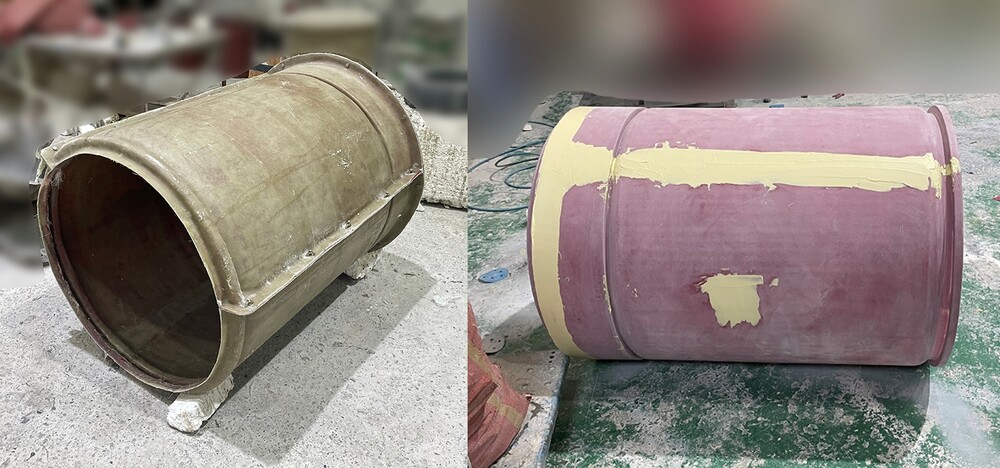 원형 조각 검수 후 이를 기반으로 몰드 제작과 FRP 조형물 성형체 제작 공정이 진행됩니다. 몰드는 동일한 형태의 조형물을 안정적으로 제작하기 위한 중요한 공정이므로 규산과 꼼꼼히 도포하고 경화 이후 FRP를 적층하여 제작합니다. 해외 팝업 전시를 위한 FRP 조형물이었기 때문에 운송 중 발생할 수 있는 충격에 즉각적인 대처가 힘들기 때문에 이를 예방하고자 FRP 적층 단계에서 튼튼하게 두께를 보강하고 내부에는 내부 골조를 추가하여 넓은 곡면 구조에서도 뒤틀림이 발생하지 않도록 설계했습니다. 성형체의 탈형 후 FRP 조형물의 이음매와 표면에 생긴 흔적을 제거하기 위해 연마 공정이 진행되며 퍼티 작업과 샌딩을 반복하여 하나의 덩어리처럼 매끄러운 표면을 완성하여 포토존 조형물의 시각적 완성도를 높이는 동시에 장기간 전시 환경에서도 안정적으로 유지될 수 있도록 제작하였습니다.