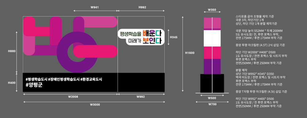 경기도 양평 평생학습축제의 콘셉트와 현장 환경에 맞춰 스티로폼 포토존 조형물의 디자인 시안 작업을 개시했습니다. 축제의 핵심 메시지인 'ㅂㅇㄷ'의 가독성을 최우선으로 고려하여 서체를 선정했고, 의미가 명확하게 전달되도록 기획했습니다. 관람 동선과 외부 설치 방식을 반영하여 조형물은 입식형 구조로 설계되었습니다. 총 높이는 1600mm를 기준으로 제작되었으며, 설치 후 조형물이 주변 환경과 자연스럽게 어우러지면서도 충분한 주목도를 확보하도록 디자인되었습니다.