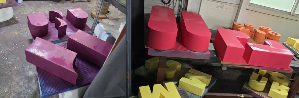 디자인 시안 확정 후, 고밀도 스티로폼을 활용해 국문 글자 조형물의 재단 작업이 이루어졌습니다. 'ㅂㅇㄷ' 글자의 외곽선은 컴퓨터 조각기를 통해 오차 없이 정밀하게 커팅되었습니다. 재단된 글자 표면은 곧바로 채색 단계로 넘어갔습니다. 도료가 뭉치거나 흘러내리는 현상을 피하고자, 분사식 도장 방식을 여러 번 얇게 덧바르는 방식으로 색을 입혔습니다. 이 레이어링 작업을 통해 균일하고 선명한 색감을 지닌 스티로폼 조형물이 최종 완성되었습니다.
