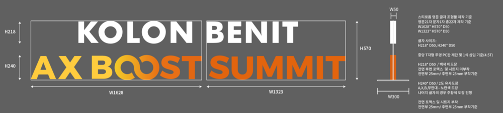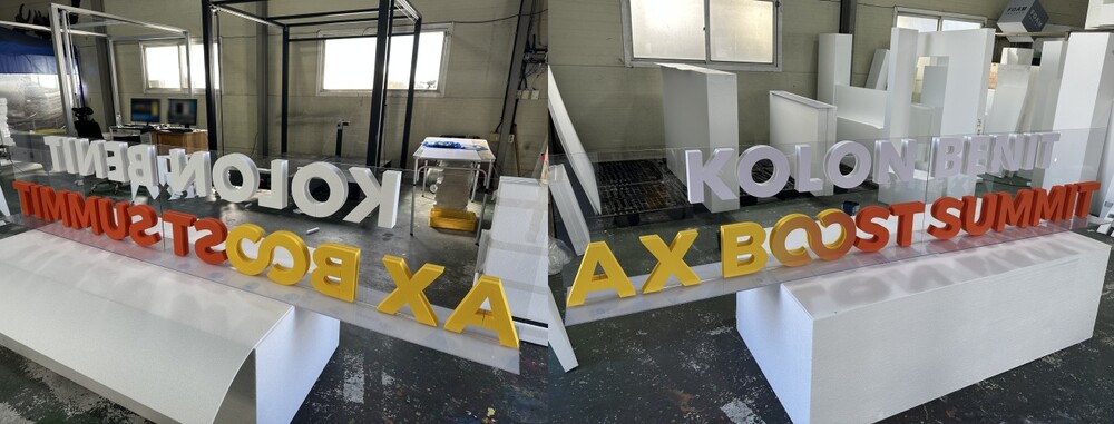 마지막 단계는 완성된 글자 조형물을 베이스 구조물에 부착하는 작업입니다. 이 과정은 조형물의 안정성과 내구성에 직접적인 영향을 주기 때문에 매우 신중하게 진행됩니다. 행사 현장에서는 조형물이 단독으로 서 있어야 했기 때문에 먼저 T자형 아크릴 지지대를 별도 제작하여 중심 구조를 잡아주었습니다. 이 지지대는 외부에서 보이지 않도록 숨김 구조로 설계해 전체 외관이 깔끔하게 유지되도록 하였으며, 전면과 후면의 글자가 동일한 위치에 정확하게 부착되도록 정교하게 위치를 맞추며 제작을 마무리해 주었습니다.
