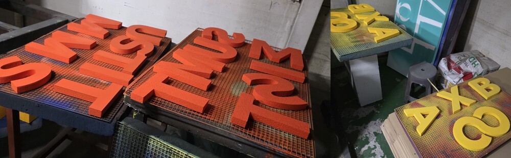 시안이 확정되면 본격적으로 스티로폼 조각 작업에 들어갑니다.고밀도 조각용 스티로폼을 사용해 각 글자를 하나씩 절단하며, 특히 영문 글자 특유의 곡선 부분은 흐트러짐 없이 자연스러운 라인이 나오도록 수작업 정제가 함께 진행됩니다. 재단이 끝난 후에는 표면을 정리한 다음 도료가 안정적으로 부착될 수 있도록 프라이머를 먼저 입혀줍니다. 도색 과정에서는 각 색의 발색과 두께가 일정하게 유지되도록 분사–건조 과정을 반복하고, 완전히 건조된 후에는 조명 아래서 색상 차이가 있는지 다시 한 번 확인합니다. 이 절차를 거친 스티로폼 조형물은 선명하고 부드러운 색감이 살아 있어 포토존이나 행사장에서도 시각적 주목도를 높여줍니다.