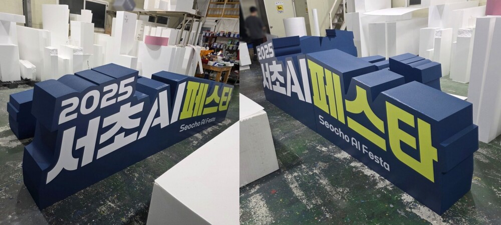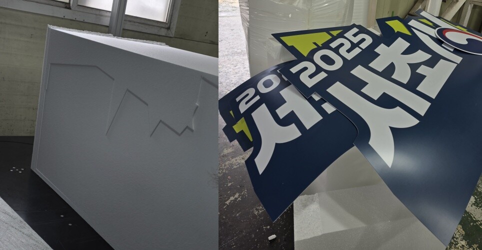 마무리 단계에서는 전면 그래픽 부착 작업이 핵심 공정으로 진행되었습니다. 출력된 시트지를 각 면에 정확하게 맞춰 부착하여 완성도를 높였습니다. 기포나 들뜸 없이 깔끔하게 마감하기 위해 세밀한 작업이 요구되었습니다. 입체 구조 특성상 곡면과 모서리 부분도 자연스럽게 이어지도록 신경 썼습니다. 부착 이후 전체적인 균형과 정렬 상태를 다시 한번 점검했습니다. 현장 설치를 고려해 안정성과 고정 방식도 함께 확인했습니다. 최종적으로 시각적 완성도와 실사용 안정성을 모두 확보한 상태로 마무리되었습니다. 완성된 조형물은 행사 현장에서 방문객들의 시선을 자연스럽게 유도하는 포인트로 활용되었습니다.