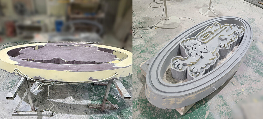 설계 시안이 최종 확정되면, 대형 조형물 제작의 첫 단계인 원형 조각 작업이 진행됩니다. 이 과정은 FRP 조형물 제작의 기반이 되는 핵심 공정으로, 전체 형태와 비례, 곡선과 단차를 결정짓는 매우 중요한 단계입니다. 고밀도 스티로폼을 활용해 대형 로고의 곡선과 깊이를 정밀하게 표현하고, 포맥스를 사용하여 양각 디테일을 강조함으로써 입체감과 구조적 안정성을 확보합니다. 원형 조각은 후속 몰드 제작과 FRP 성형체 제작의 기준이 되며, 크롬 로고 도장이 적용될 대형 로고 간판 조형물 설치의 최종 완성도와 품질에 직접적인 영향을 미칩니다. 이 과정에서 클라이언트와 함께 형태, 두께, 비례를 꼼꼼히 검토하며, 빛과 그림자가 자연스럽게 흐를 수 있는 최종 실루엣을 확정하고, 이후 모든 제작 과정의 기준이 되는 핵심 레퍼런스로 활용됩니다.