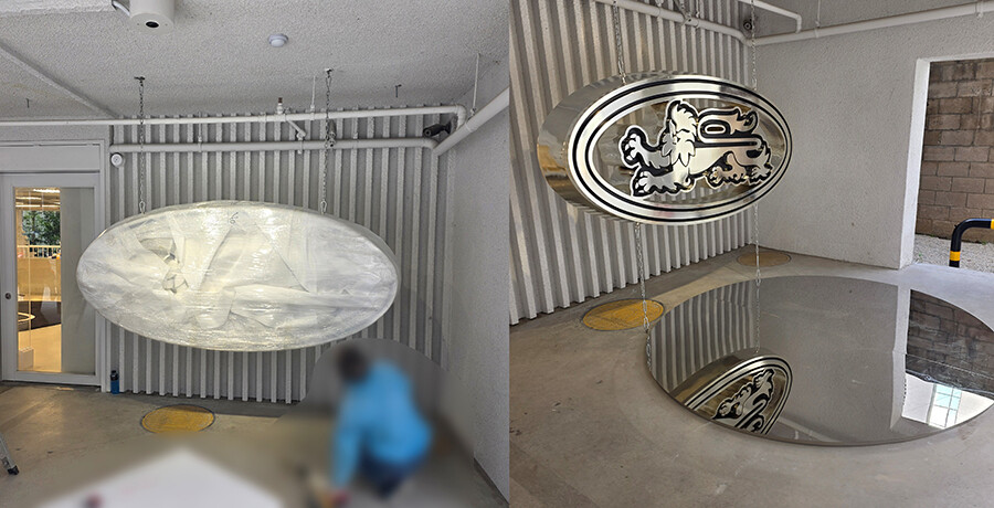 FRP 성형체 표면이 정리되면, 크롬 로고 도장을 포함한 도색 공정이 진행됩니다. 먼저 프라이머와 전도성 도료를 도포하여 FRP 조형물 표면과 도료층 간 접착력을 강화하고, 특수 설비를 사용해 FRP 위에 도장층을 쌓아 금속과 유사한 은경막을 형성합니다. 이 과정을 통해 비금속 소재인 FRP가 마치 실제 금속처럼 빛을 반사하며 공간 속 존재감을 발휘하게 됩니다. 도색 작업 완료 후에는 투명 클리어 코팅을 반복하여 외부 환경에서도 내구성을 확보하며, 비, 바람, 자외선에도 변색이나 손상 없이 유지됩니다. 이렇게 완성된 조형물은 단순한 FRP 구조물을 넘어, 매장 외부 공간에서 빛과 그림자가 어우러진 대형 로고 간판 조형물로서, 관람자에게 전시공간과 같은 시각적 경험을 제공하며, 매장 입구를 대표하는 브랜드 조형물 아이덴티티로 기능하게 됩니다.