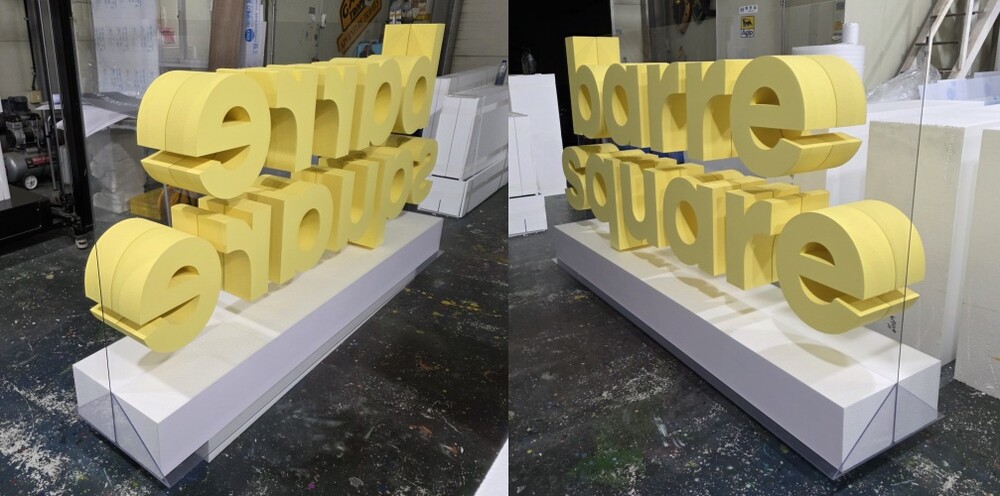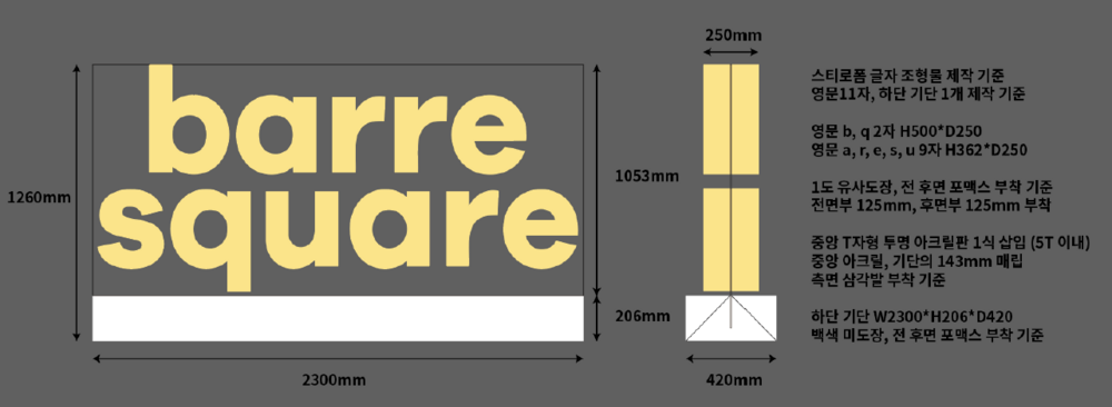 조형물 제작의 시작은 바로 디자인 시안 단계에서 이루어집니다. 단순히 글자를 만드는 것이 아니라, 행사 공간과 브랜드의 전체적인 분위기를 고려해 형태와 비율, 색상 톤까지 세심하게 설계하는 과정입니다. 이번 프로젝트에서는 부드럽고 친근한 이미지를 전달하는 ‘barre square’ 로고를 바탕으로 글자의 굵기와 높이, 간격을 하나씩 조정하며 멀리서 보았을 때도 가독성이 좋고 입체감이 살아나도록 신경 썼습니다.