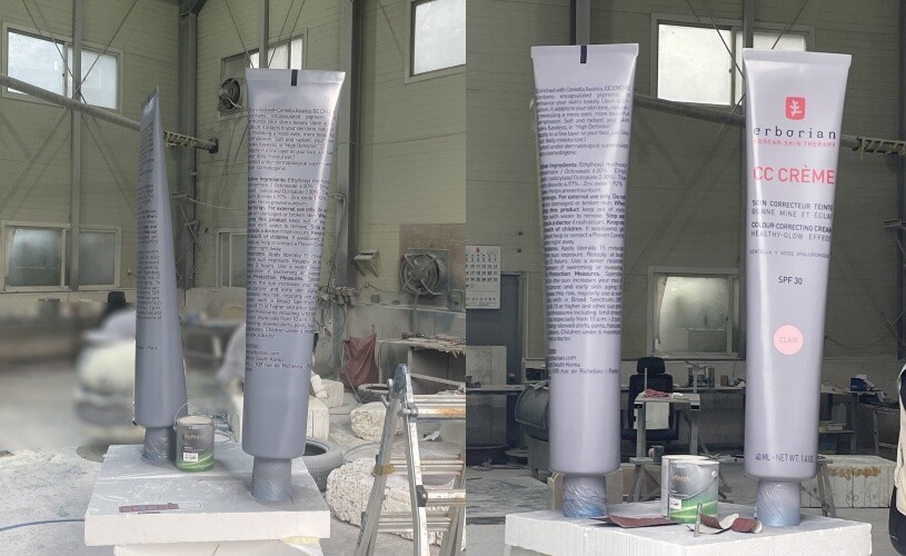 화장품 브랜드 홍보용 조형물은 멀리서도 제품의 특징을 직관적으로 전달해야 합니다.