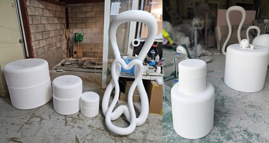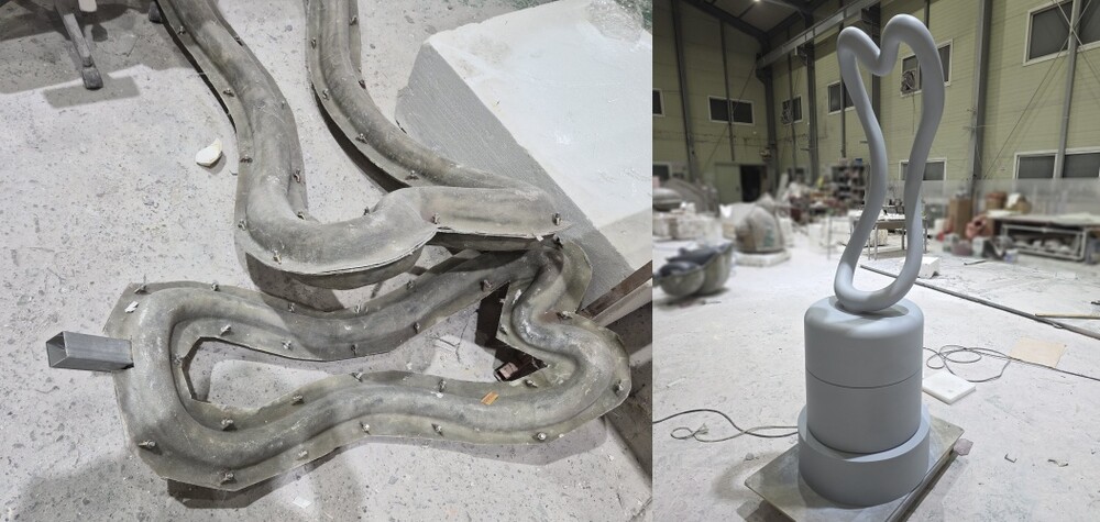 원형조각 단계에서는 출력된 데이터를 기준으로 입체 형태를 실제 재료로 구현했습니다. 표면의 미세한 단차와 이음부를 반복적으로 수정하며 완성도를 끌어올렸습니다. 하부 원통 구조 역시 상부 조형과의 비례를 맞추어 안정적으로 제작했습니다. 현장 환경을 고려해 내부 보강 위치도 이 단계에서 함께 설계했습니다. 최종적으로 매끄러운 표면 상태를 확보한 뒤 다음 공정으로 넘어갈 준비를 마쳤습니다.