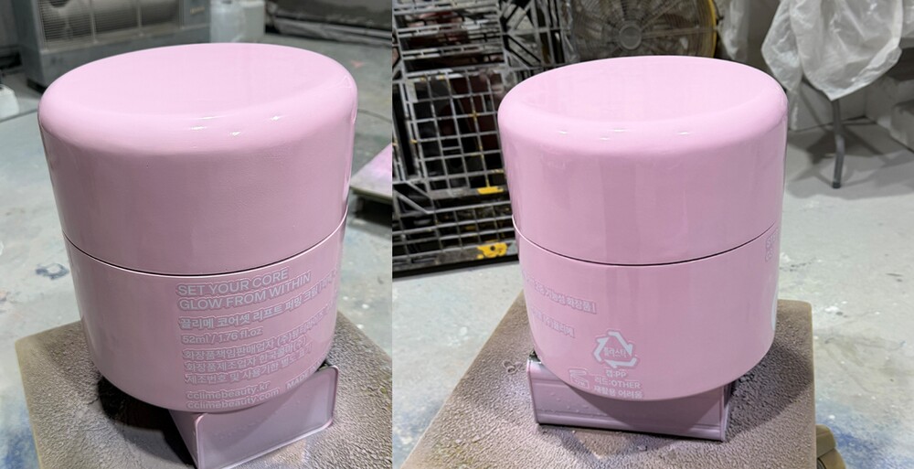 성형체가 완성된 후에는 본격적인 도색 공정에 앞서 도료의 밀착력을 높이고 표면 조도를 균일하게 만드는 프라이머 도포 작업을 선행했습니다. 뷰티 전시에 사용될 FRP 화장품 조형물 제품 특유의 우아하고 섬세한 색감을 오차 없이 재현하기 위해, 팬톤 컬러를 기반으로 정밀 조색된 특수 도료를 사용했습니다. 도색은 분사식 도장 방식을 채택하여 여러 겹의 레이어를 얇게 쌓아 올리는 레이어링 기법을 적용했으며, 이 과정에서 도료가 뭉치거나 FRP 뷰티 조형물 표면에서 흘러내리지 않도록 숙련된 기술자의 세밀한 컨트롤이 투입되었습니다. 이후 브랜드 로고와 텍스트 등 FRP 화장품 조형물의 정체성을 드러내는 디테일 요소들은 시트지 통출력을 통해 날카롭고 깔끔하게 표현했습니다. 도료가 완전히 건조된 뒤에는 뷰티 전시 조형물의 심미적 완성도를 최고조로 끌어올리고, 외부 자극으로부터 외관을 보호하기 위해 고급스러운 유광 클리어 코팅으로 마감하여 하이엔드 퀄리티를 완성했습니다.