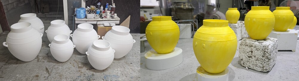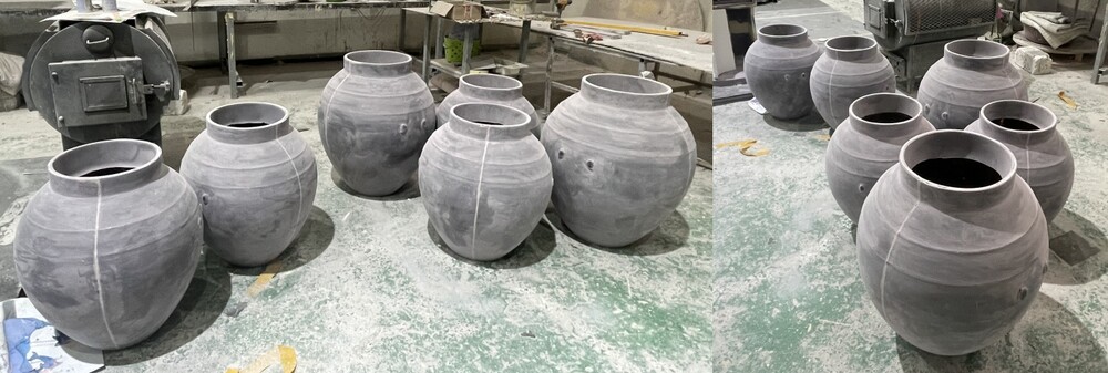 디자인 시안이 확정된 뒤에는 FRP 성형을 위한 핵심 단계인 원형 조각 제작에 바로 들어갔습니다. 이 원형 조각은 이후 수백 개의 FRP 항아리가 복제되는 기반이기 때문에, 아주 미세한 비율 차이도 허용되지 않았습니다. 완성된 첫 원형은 매장의 전체 분위기를 이끌 핵심 조형물의 기준점이 되었으며, 몰드 작업 전 규산을 꼼꼼히 도포해 표면 손상을 막고 탈형이 원활하도록 준비한 뒤 본격적인 FRP 제작 공정으로 이어졌습니다.