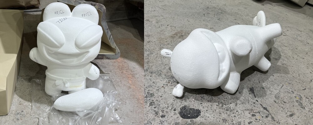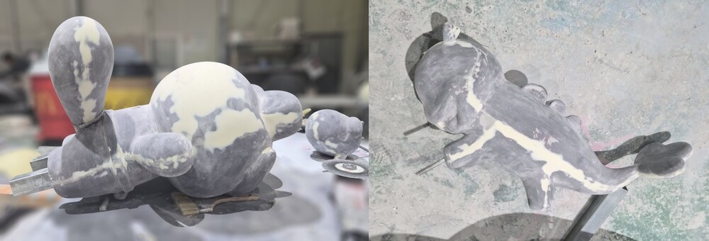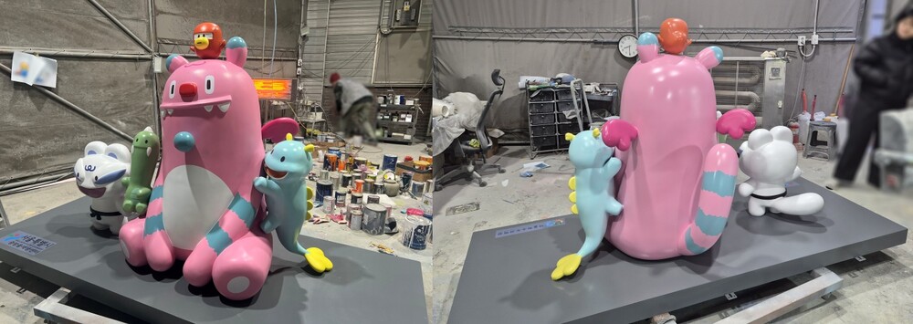 형태 작업이 마무리된 대형 FRP 마스코트에는 본격적으로 색과 표정이 더해지는 도색 공정이 진행됩니다. 팬톤 컬러를 기준으로 각 캐릭터의 메인 컬러를 조색하고, 파스텔 톤 특유의 부드러운 분위기가 살아나도록 도료의 농도와 광택을 세밀하게 조절했습니다.도색은 얇은 레이어를 여러 번 쌓는 방식으로 진행해 번짐이나 얼룩을 방지하고, 넓은 면부터 포인트 컬러까지 단계적으로 완성해 나갔습니다. 눈과 입, 표정 요소와 같은 디테일은 마스킹과 시트 작업을 병행해 또렷하게 표현했으며, 각 캐릭터의 개성이 자연스럽게 드러나도록 마무리했습니다.