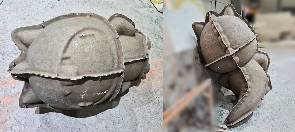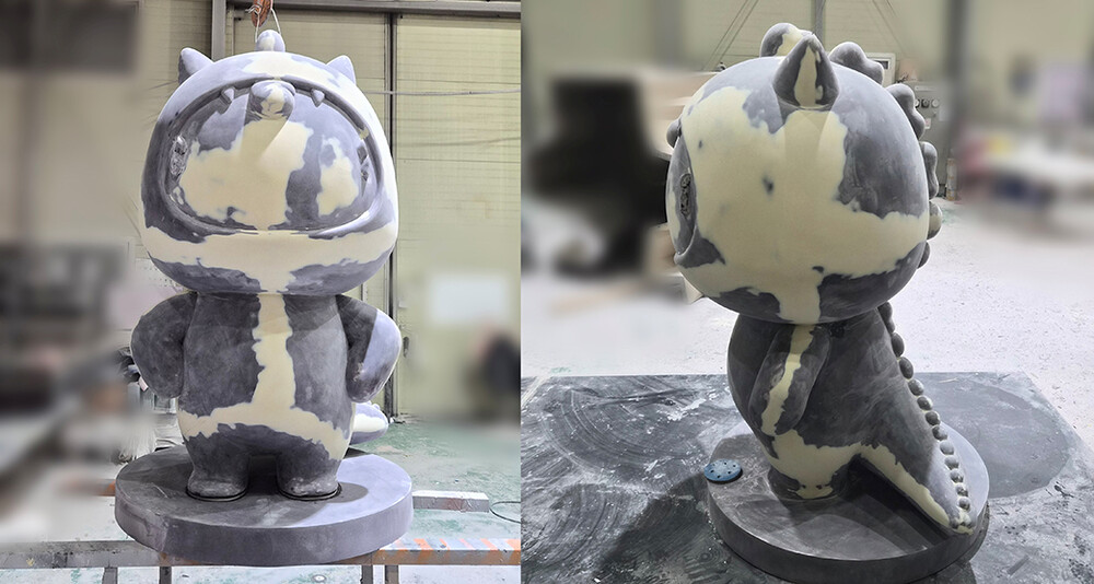 정밀하게 완성된 대형 캐릭터 FRP 조형물 몰드 안착면에 FRP를 촘촘히 쌓아 올려 고드래곤의 단단한 골격을 형성했습니다. FRP 조형물 특유의 부피감은 살리되 내부를 비워 가동성을 높였으며, 겹겹이 이어진 레이어링을 통해 외부 충격에도 끄떡없는 내구성을 확보했습니다. 특히 복잡한 조형물의 곡선 구간에서 발생할 수 있는 형태 왜곡을 방지하기 위해 맞춤형 내부 보강재를 삽입하여 전체적인 구조적 밸런스를 잡았습니다. 경화가 끝난 후 몰드에서 분리된 조형물 개별 파츠들은 면밀히 설계된 기준점에 맞춰 오차 없이 결합하고, 접합부의 흔적을 지우는 작업을 수행했습니다. 탈거 후 대형 조형물 표면의 거친 요철이나 미세한 구멍들은 퍼티 공정을 통해 꼼꼼히 메워 빈틈없는 매끄러움을 구현했습니다. 이어지는 샌딩 작업에서는 단계별로 진행하여 도료가 조형물에 가장 이상적으로 안착할 수 있는 최적의 표면 상태를 만들었습니다. 이렇듯 집요한 다듬질 끝에 마침내 채색을 위한 완벽한 공공기관 캐릭터 조형물 성형체가 탄생했습니다.