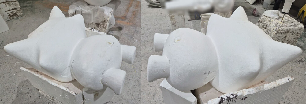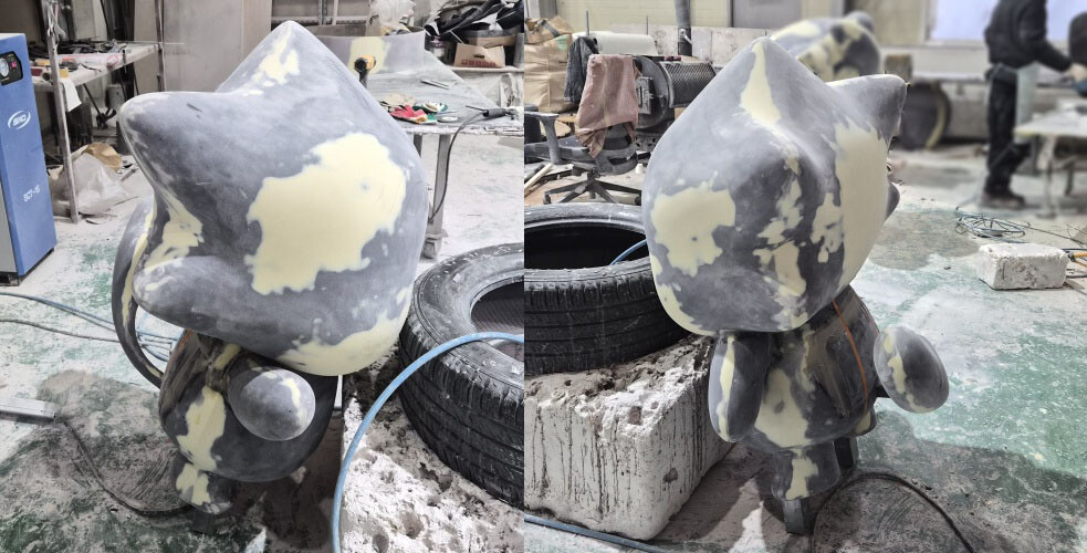 디자인 시안을 바탕으로 실제 크기의 원형 조각 작업을 진행합니다. 원형은 조형물의 전체 인상과 완성도를 결정하는 핵심 공정으로, 캐릭터의 볼륨감과 균형, 정면과 측면에서 보이는 형태를 모두 고려해 입체적으로 구현합니다. 정면에서 보이는 모습뿐 아니라 측면과 후면에서도 어색하지 않도록 형태를 반복 수정하며, 특히 표정, 팔, 꼬리와 같은 포인트 요소는 캐릭터의 인상을 좌우하기 때문에 세밀하게 다듬습니다. 이 원형 단계에서 조형물의 전체 분위기와 방향성이 결정되며, 이후 공정의 기준이 되는 만큼 충분한 검토와 보완 작업을 거쳐 완성도를 높입니다.