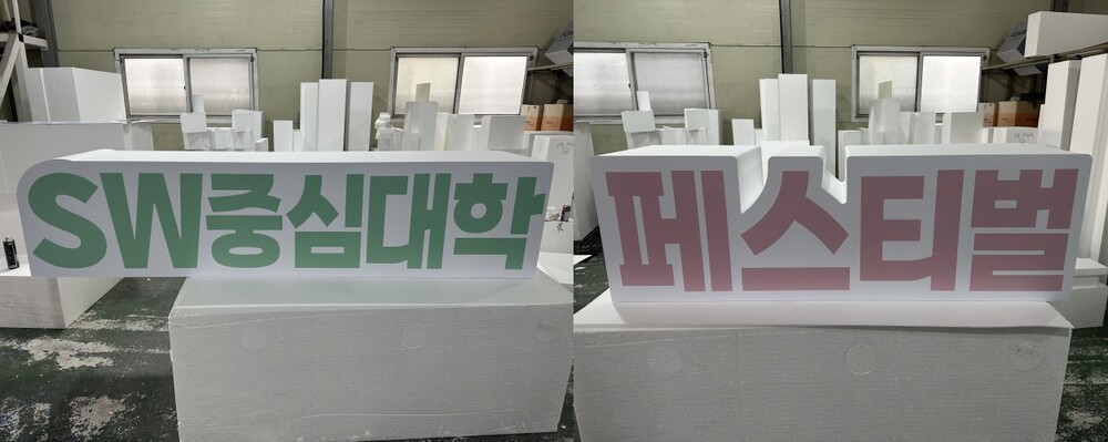 이번 작업은 실내 무대 앞에 설치될 대형 스티로폼 글자 조형물을 제작하는 프로젝트로 진행되었습니다.