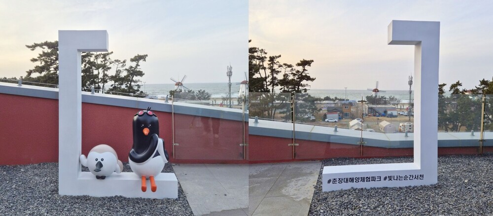 이번 프로젝트 역시 바다 풍경을 배경으로 지역 캐릭터를 함께 배치하여 방문객이 자연스럽게 머물고 촬영할 수 있는 조형 포토존 제작 사례입니다.