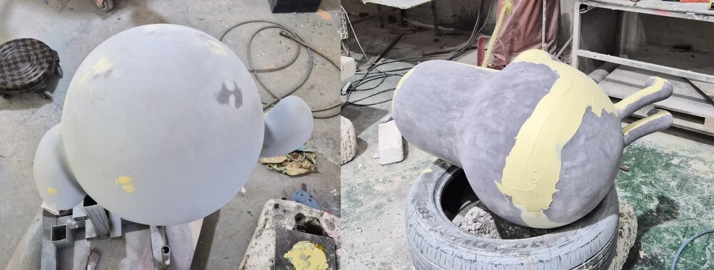 완성된 원형을 기반으로 조형물 제작을 위한 몰드 작업이 진행됩니다. 몰드는 캐릭터 형태를 그대로 복제할 수 있도록 정밀하게 제작되며 이후 FRP 성형의 기준이 되는 중요한 공정입니다. 몰드 내부에는 FRP를 적층하여 단단한 성형체를 만들어 냅니다. 이 과정에서 두께와 강도를 일정하게 유지하는 것이 매우 중요합니다. 여러 번의 적층 작업을 통해 외부 환경에서도 견딜 수 있는 구조적 강도를 확보합니다. 성형이 완료되면 몰드에서 분리하여 조형물의 기본 형태가 완성됩니다.
