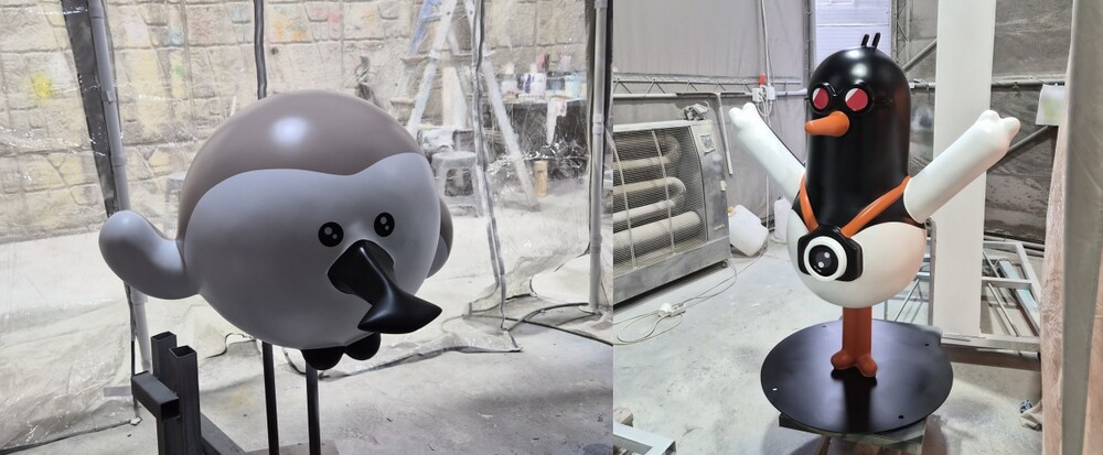 디자인 시안 단계에서는 캐릭터의 표정과 동작이 주는 인상을 가장 먼저 정리했습니다. 둥근 바디 형태를 중심으로 팔다리와 소품이 과하지 않게 어우러지도록 비율을 조정했습니다. 정면뿐 아니라 측면과 사선에서도 캐릭터가 명확하게 인지될 수 있도록 실루엣을 다듬었습니다. 색상 구성 역시 공간 안에서 튀지 않으면서도 눈에 잘 띄도록 톤을 조절했습니다. 실제 제작이 가능한 구조인지 여부도 함께 검토하며 시안을 구체화했습니다. 이렇게 정리된 디자인은 이후 모든 제작 공정의 기준점이 됩니다.