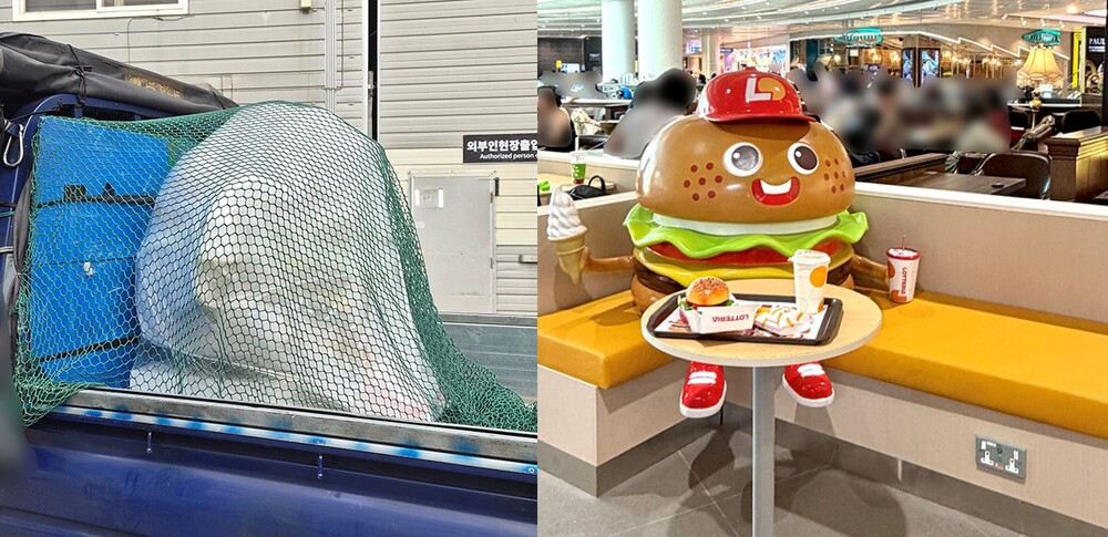 햄버거를 형상화한 캐릭터 조형물은 복합 쇼핑몰 내에서 방문객의 시선을 사로잡습니다.