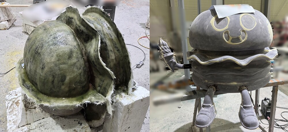 원형 조각이 완료되면 조형물 설계를 기반으로 한 몰드 제작과 FRP 성형 단계가 진행됩니다. 먼저 원형 표면에 규산 처리를 하여 원형의 표면을 단단하게 보호하고 원형이 틀어지는 것을 방지한 뒤, 이를 바탕으로 정밀한 몰드를 제작합니다. 이후 몰드 내부를 정리하고 FRP를 여러 겹 적층하여 단단한 성형체를 완성합니다. 이번 대형 FRP 햄버거 모형은 실내 환경에서의 높은 활용도를 고려하여 내부에 각파이프를 보강함으로써 촵딱이 캐릭터 조형물의 구조적 안정성을 강화했습니다. 특히 캐릭터 조형물이 장기간 사용되더라도 변형 없이 유지될 수 있도록 중심축과 하단 베이스 구조를 조형물 설계 단계에 맞춰 정밀하게 구현했습니다. 성형체 작업과정에서는 표면에 발생하는 기포와 요철을 제거하기 위해 퍼티 작업과 샌딩 과정을 반복하여 매끄러운 외형을 완성합니다.