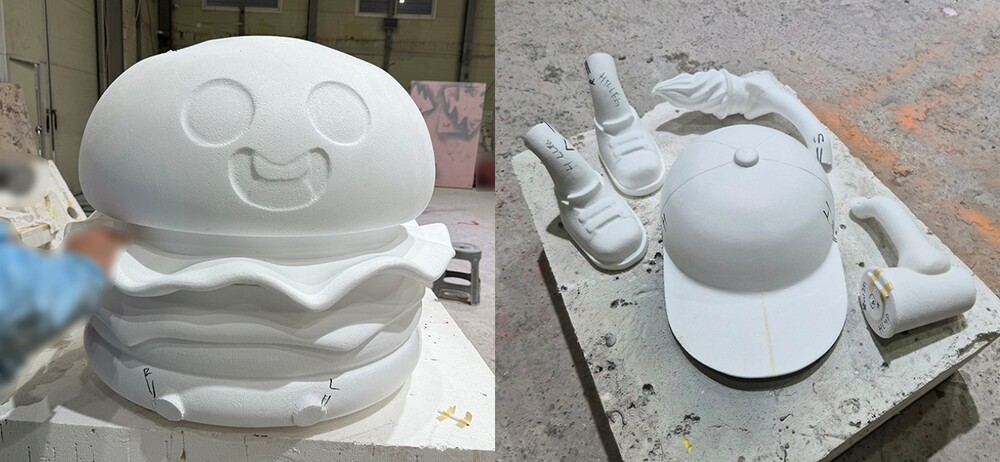 대형 햄버거 FRP 조형물의 완성도를 결정짓는 다음 단계는 원형 조각 작업입니다. 조형물 설계를 기반으로 스티로폼을 활용해 햄버거 모형의 기본 형태를 입체적으로 구현했습니다. 이 과정에서는 햄버거 촵딱이 번의 곡선과 패티의 두께감, 캐릭터의 표정과 팔다리 디테일까지 정밀하게 표현하는 것이 중요합니다. 특히 촵딱이 캐릭터 조형물은 단순한 형태 재현을 넘어 방문객에게 친근함과 생동감을 전달해야 하기 때문에, 반복적인 수정과 보완을 통해 완성도를 높였습니다. 실내 전시용 대형 조형물은 다양한 각도에서 관찰되므로 어느 방향에서도 자연스럽게 보이도록 입체감을 세밀하게 다듬는 작업이 필수적입니다. 이러한 과정에서 조형물 설계 단계에서 설정된 촵딱이의 비례와 균형이 정확하게 구현되도록 지속적인 확인과 수정이 이루어집니다. 원형 조각은 이후 FRP 몰드 및 성형체 제작의 기준이 되는 핵심 공정으로, 전체 제작 과정에서 매우 중요한 역할을 담당합니다.