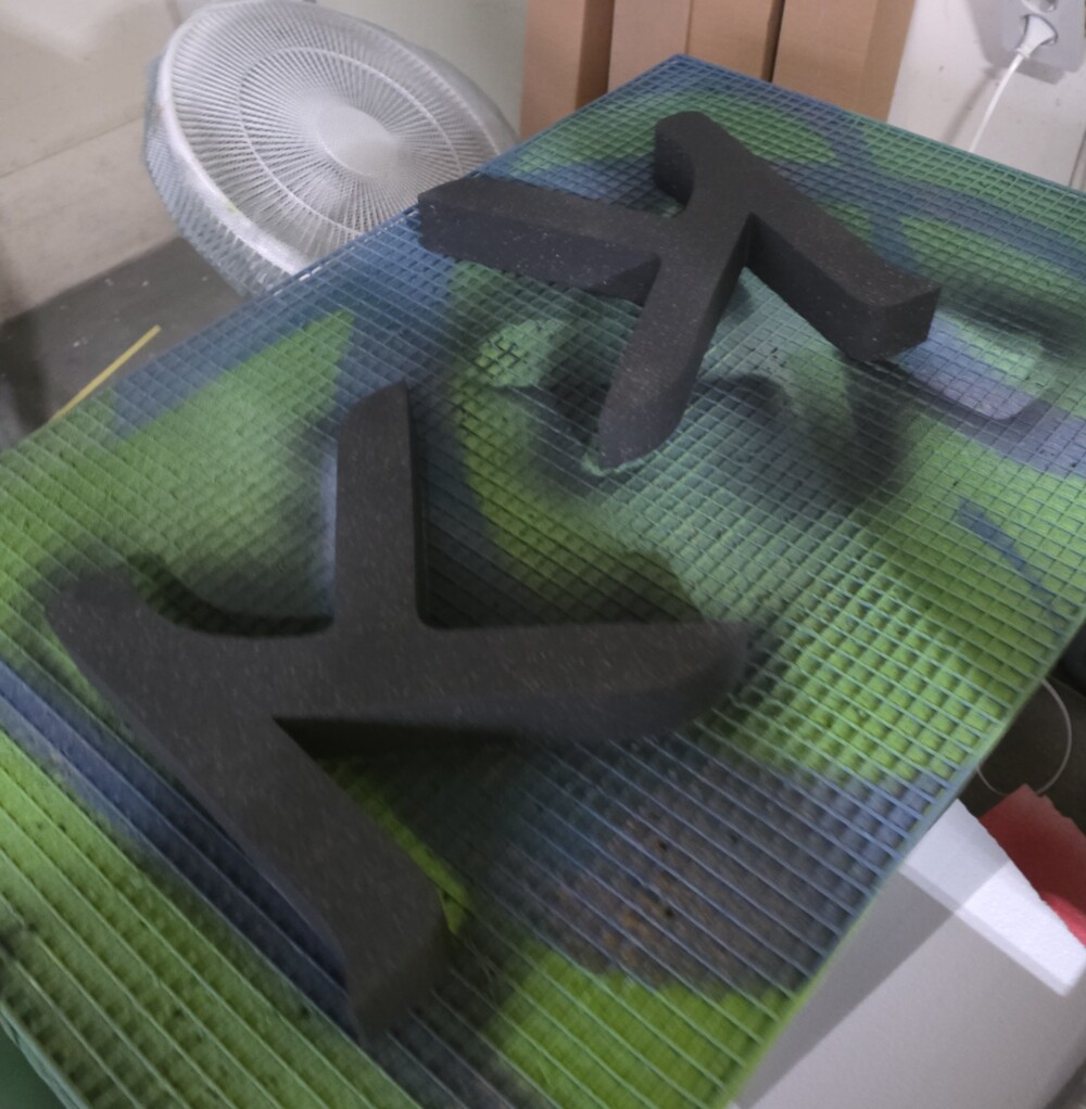 디자인 시안이 확정된 후에는 본격적인 제작 단계로 넘어가며, 컴퓨터 조각기를 활용해 정밀하게 스티로폼 조형물 재단 작업이 진행됩니다.이번 작업에서는 일반 소재가 아닌 고밀도 소재를 사용해 단단하고 정교한 글자 조형물을 제작할 수 있도록 했습니다.각 글자는 동일한 형태로 두 세트를 제작하여 입체감을 높이는 스카시 조형물 구조로 제작되었습니다.재단이 완료된 후에는 사전에 협의된 컬러를 기준으로 도색 작업이 진행되며, 얇게 여러 번 겹쳐 칠하는 방식으로 스티로폼 조형물 표면의 균일도를 높였습니다.이 과정을 통해 완성된 글자 조형물은 매끄러운 질감과 선명한 색감을 갖춘 스카시 조형물 형태로 완성됩니다.