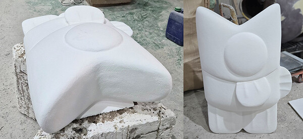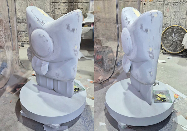 확정된 설계를 바탕으로 캐릭터 정어리다의 실물 형태를 만드는 원형 조각 단계에 착수했습니다. 조형물 제작의 퀄리티를 결정짓는 이 공정에서는 스티로폼 블록을 사용합니다. 곡선표현에 용이한 스티로폼을 이용해 애니메이션 속 캐릭터의 미세한 표정 하나까지 수작업으로 다듬어 나갑니다. FRP 조형물의 모태가 되는 이 원형은 360도 어느 각도에서 보아도 완벽한 대칭을 이루어야 하기에, 끊임없는 실측과 검수 과정을 반복합니다. 볼록하게 튀어나온 눈망울과 매끄러운 유선형 바디는 전시 포토존을 찾는 이들에게 친근함을 주는 핵심 요소입니다. 이후 섬세한 샌딩 페이퍼 작업으로 완성된 매끄러운 표면은 일반적인 캐릭터 조형물을 넘어선 예술적 완성도를 보여줍니다. 생동감 넘치는 실루엣이 완성될수록 FRP 포토존으로서의 존재감은 더욱 뚜렷해지며 다음 공정을 위한 완벽한 기준점을 제시합니다.