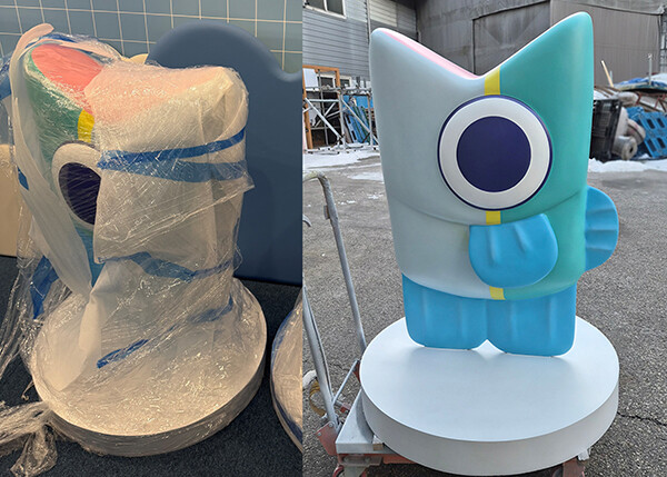 원형 조각이 마무리되면 이를 영구적인 소재로 전환하는 몰드 제작 및 성형 작업을 진행합니다. 캐릭터 정어리다의 형태를 유지하기 위해 스티로폼 원형에 규산을 도포해주어 몰드작업을 진행해줍니다. 이후 성형체 작업에선 내부에 FRP를 겹겹이 쌓아 올리는 FRP 조형물 적층 공법을 적용합니다. 이 과정에서 내부 각파이프를 매립하여 전시중에 생길 수 있는 충격에도 변형되지 않는 단단한 껍질을 구축하는 것이 조형물 제작의 기술력입니다. 탈형된 성형체는 표면의 기포와 요철을 제거하기 위해 퍼티를 바르고 샌딩기로 연마하는 과정을 여러번 반복합니다. 마치 애니메이션 속 매끈한 피부 질감을 구현하듯 정교한 물샌딩을 거쳐 도자기 같은 표면을 완성합니다. 이러한 기초 작업이 완벽해야만 캐릭터 조형물이 전시 포토존으로서 장기간 사용되어도 고유의 퀄리티를 유지할 수 있습니다. 튼튼한 내구성과 가벼운 무게를 동시에 갖춘 FRP 포토존은 이제 색을 입기 위한 최상의 컨디션을 갖추게 됩니다.