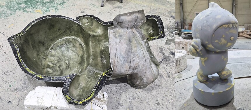 원형이 완성되면 단단한 FRP 성형체를 구축하는 단계로 넘어갑니다. 원형이 틀어지지 않도록 표면에 규산 도포 후 몰드를 제작하고, 몰드 내부의 기포자국과 거친면을 다듬은 다음 그 내부에 FRP를 촘촘하게 교차 적층하여 강한 내구성을 지닌 캐릭터 FRP 형성합니다. 이동을 고려하여 성형 과정에서 각파이프로 내부 프레임을 견고하게 매립함으로써 조형물의 강성을 극대화했습니다. 몰드에서 탈형된 전시 조형물 성형체는 표면의 미세한 기포나 요철을 제거하기 위해 폴리 퍼티를 메우고 연마하는 작업을 수없이 반복합니다. 이러한 정밀 샌딩 작업은 조형물 디자인이 의도한 도자기 같은 질감을 현실화하는 필수적인 공법입니다. 매끄럽게 다듬어진 FRP 표면은 향후 도색 공정에서 컬러의 발색력을 높여주며, FRP 포토존을 이용하는 관람객들에게 이질감 없는 최상의 촉감과 시각적 경험을 제공합니다. 보이지 않는 내벽부터 겉면까지 이어지는 꼼꼼한 FRP 기술력은 고퀄리티 마스코트 탄생의 기반이 됩니다.