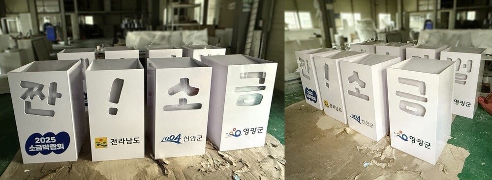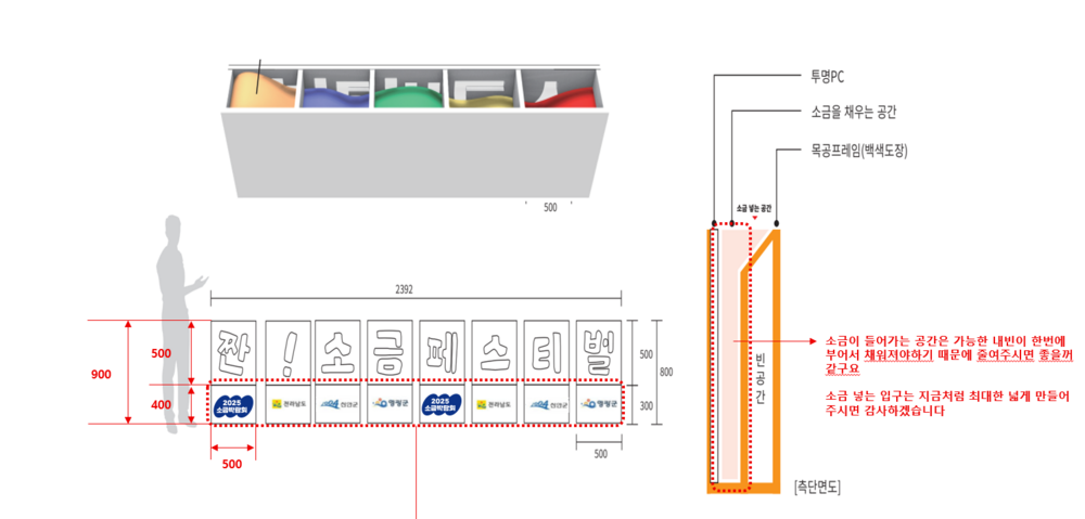 디자인 시안 단계에서는 행사명을 직관적으로 전달할 수 있도록 각 글자를 개별 오브제로 구성하고 전체를 일렬로 배치해 가독성을 높였습니다. 내부에 소금을 채울 수 있는 구조를 반영하여 단순한 조형이 아닌 체험형 오브제로 확장되도록 설계했습니다. 전면은 글자 형태를 타공해 내부가 보이도록 구성하고 측면은 안정적인 프레임 구조로 잡아 내구성을 확보했습니다. 또한 하단에는 행사 및 지자체 로고가 자연스럽게 노출될 수 있도록 별도의 면을 구성해 홍보 요소도 함께 담았습니다. 전체 높이와 폭은 실제 행사 무대 스케일과 사람의 시선을 고려해 비례감을 맞췄습니다. 내부 공간은 한 번에 소금을 채울 수 있도록 단순하면서도 효율적인 구조로 정리했습니다. 상단 투입구는 작업 편의성을 고려해 넓게 확보하여 운영 시 불편함을 최소화했습니다. 이러한 요소들을 종합해 디자인 시안은 심미성과 실용성을 동시에 만족하는 방향으로 완성되었습니다.