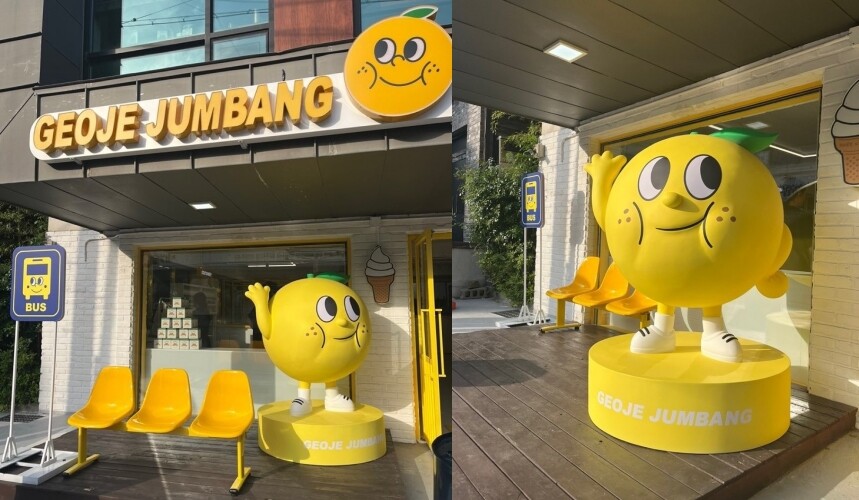 경상남도 거제시의 한 카페 매장 입구에 유자를 보티브로 한 캐릭터조형물이 설치되었습니다.