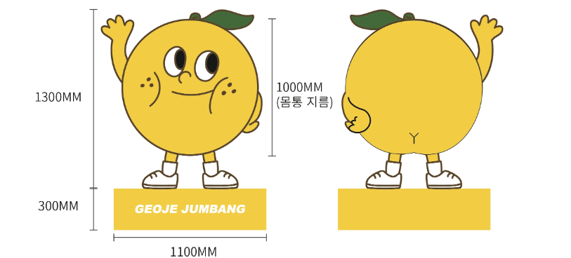포토존 조형물 제작을 위해 디자인 시안을 먼저 작업해 주었습니다. 이번 거제점방카페 조형물 디자인 시안은 클라이언트께서 제공을 해주셔서 조형물의 비율, 형태, 크기 등 간단한 디자인 작업을 진행하였습니다. 또한 유자 조형물 부피 대비 바닥에 닿는 면적이 적어 FRP 조형물이 안정적으로 서 있을 수 있도록 하단 기단을 추가해 주었습니다.