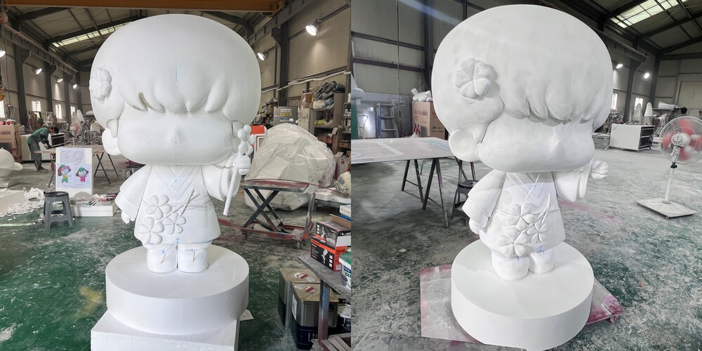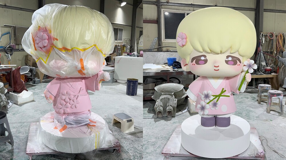 원형 조각이 완료된 조형물은 도색 작업을 위해 프라이머를 도포해 주었습니다. 도색 작업은 분사식 방법을 활용하여 얇게 여러 번 레이어드하여 도료가 뭉치거나 흐르는 것을 방지해 주었으며 연한 색상부터 진한 색상 순서대로 색상이 혼탁해지지 않도록 꼼꼼하게 작업을 진행해 주었습니다. 조형물의 눈, 볼, 꽃 등의 디테일한 부분들은 시트지와 마스킹 작업을 통해 깔끔하게 표현해 주었습니다.