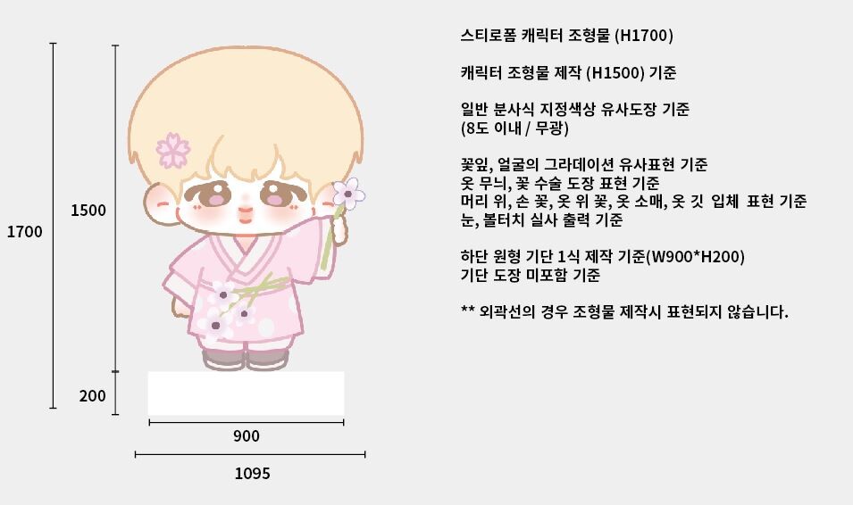 이번 방탄소년단 지민 단기 행사용 스티로폼 캐릭터 조형물 프로젝트는 클라이언트가 제공해 주신 이미지 자료를 기반으로 꽃도령 캐릭터를 입체적으로 구현하기 위해 디자인 시안을 작업을 제작하였습니다. 스티로폼 조형물의 경우 야외 행사에 일주일 이내로 설치되는 일정에 맞춰, 단기 전시에 적합한 소재입니다. 또한 캐릭터가 스스로 안정적으로 서있는 구조로 설계가 진행되었습니다.