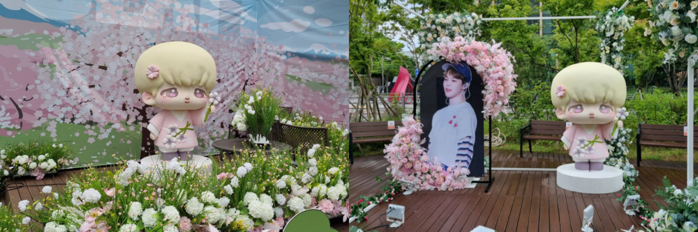 BTS 지민의 컴백과 데뷔 9주년을 기념하여 팬들의 서포트 이벤트 현장에 설치된 입체 스티로폼 캐릭터 조형물 제작 사례입니다.