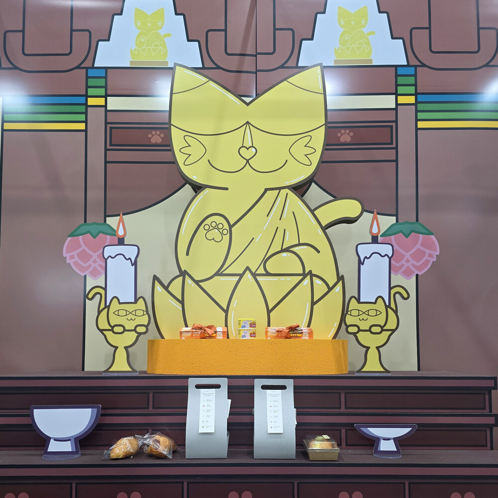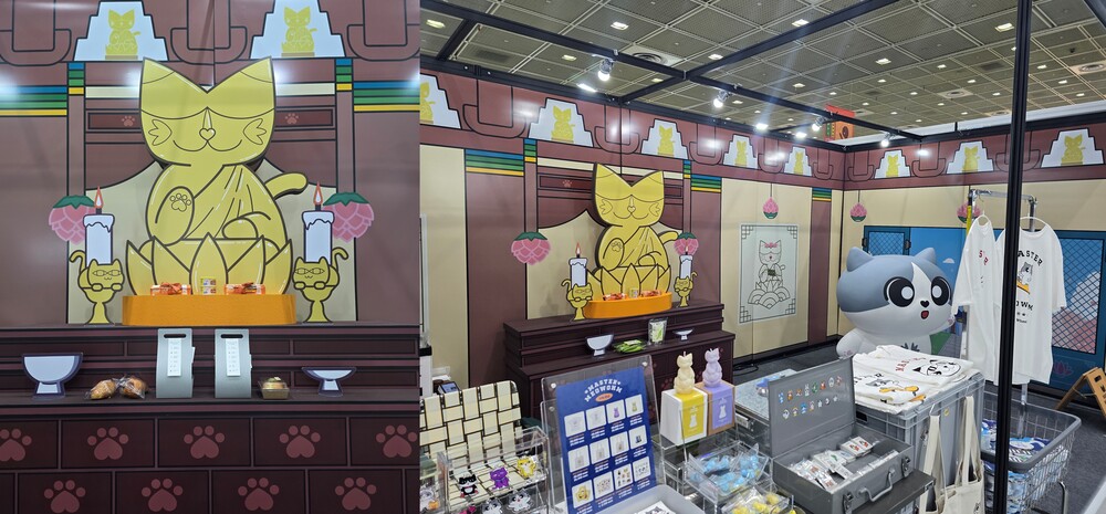 서울 코엑스에서 열린 2025 국제불교 박람회에 불교 캐릭터를 친화적으로 해석한 ‘냐옴스님’ 캐릭터를 활용한 스티로폼 조형물이 전시되었습니다.