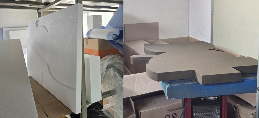 재단 작업은 디자인 시안 확정 후 시안의 맞추어 작업이 진행됩니다. 스티로폼 조형물의 경우 고밀도 스티로폼을 사용하여, 조형물 제작이 진행되고 있습니다. 스티로폼은 컴퓨터 열선 장비를 활용하여 외곽선 기준으로 정밀하게 커팅이 진행됩니다. 컴퓨터 장비를 활용한 재단 작업 시에는 캐릭터의 부드러운 곡선과 세밀한 디테일을 정확히 구현해 낼 수 있습니다.