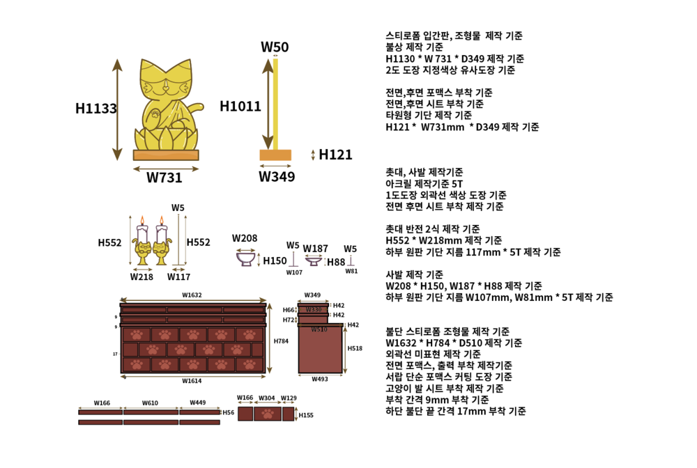 2025 국제불교 박람회 조형물 ‘냐옴스님’ 캐릭터 시안작업 시에는 캐릭터 고유의 분위기와 메시지를 효과적으로 전달하기 위해서, 실내 전시 환경에 최적화된 형태와 색감으로 디자인 설계가 진행되었습니다. ‘냐옴스님’ 캐릭터 조형물의 경우 클라이언트로부터 전달받은 기본 캐릭터 자료를 바탕으로 전시 환경과 조형물 안정성을 고려한 구조 설계 및 크기 조정이 진행되어 시안이 작성되었습니다.