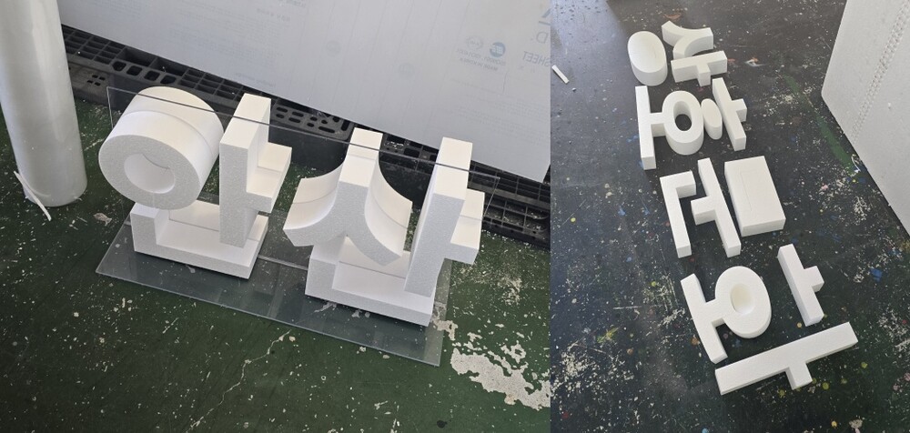 스티로폼 글자 조형물의 재단이 완료되면 제작의 마지막 단계인 조형물 부착 작업이 진행됩니다. 제작된 글자 조형물은 미리 준비된 T자 형태의 아크릴 지지판에 전면과 후면 동일한 위치로 부착하여 안정적인 스탠딩 구조를 완성합니다. 이번 프로젝트는 문구를 여러 단어로 나누어 제작한 형태로 진행되어 각 글자 조형물을 분할된 아크릴 지지대에 맞추어 부착하는 방식으로 제작되었습니다. 특히 한글 글자 조형물의 경우 자음과 모음의 간격과 행간을 안정적으로 유지해야 하기 때문에 중앙에 T자형 아크릴 지지대를 적용하여 균형과 구조 안정성을 함께 확보하는 방식으로 제작되었습니다.