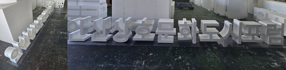 디자인 시안이 확정된 이후에는 행사 조형물 제작을 위한 스티로폼 글자 재단 작업이 진행됩니다. 스티로폼 스카시 글자의 경우 재단 과정에서 글자의 두께와 크기를 충분히 확보하는 것이 중요한데, 두께가 지나치게 얇을 경우 컴퓨터 조각기의 열선 작업 과정에서 형태가 손상될 수 있기 때문입니다. 이번 무대용 스티로폼 글자 조형물은 별도의 도색 없이 스티로폼 본연의 백색 상태로 제작을 진행했으며 포맥스나 시트지 마감도 적용하지 않는 방식으로 제작되었습니다. 이러한 방식으로 제작될 경우 스티로폼 소재 특유의 질감과 재단 과정에서 생기는 열선 표현이 표면에 자연스럽게 드러날 수 있습니다.