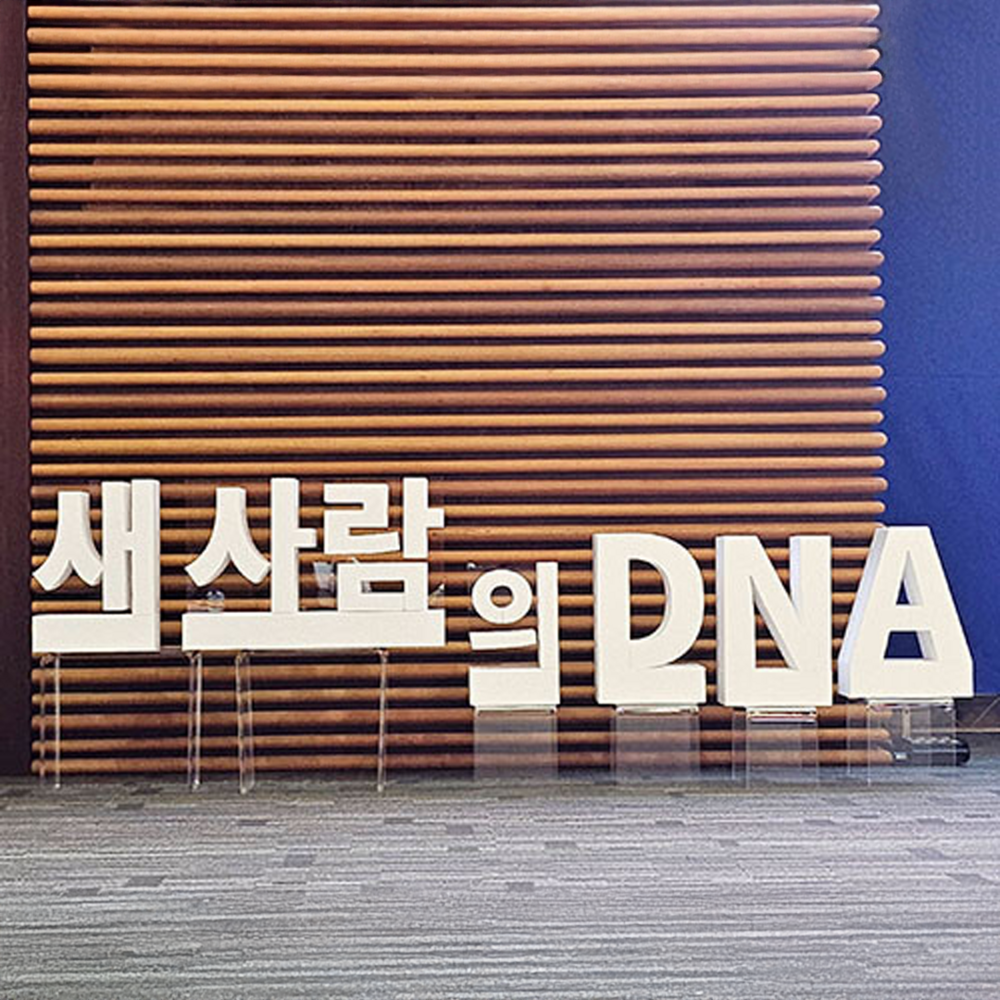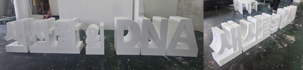 대형 국문 스티로폼 조형물은 클라이언트의 요청에 따라 맞춤형 디자인 시안 작업을 거쳐 제작이 진행되었습니다. ‘새 사람의 DNA’ 라는 문구가 무대 위에서도 명확하게 돋보일 수 있도록 글자의 크기와 자간, 서체를 정교하게 조율하여 디자인 시안이 제작 되었스빈다. 또한 글자가 공중에 떠있는 듯한 효과를 주어야 함으로 제작 전 단계에서 조형물의 구조, 후가공 방식 등을 사전 검토해, 실제 제작 가능한 방향으로 시안이 설계되었습니다.