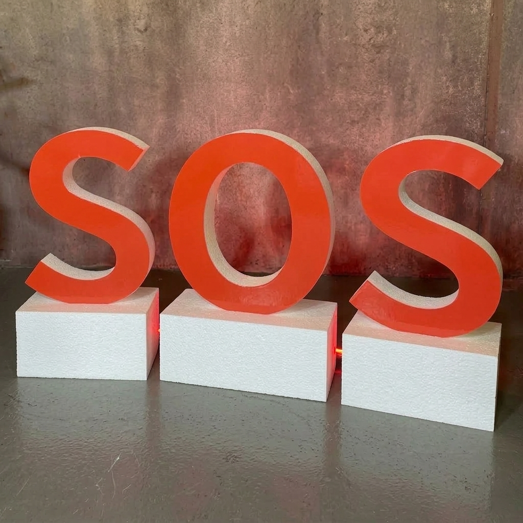 실내 인테리어 스티로폼 조형물로 제작된 ‘SOS’는 각 글자를 분할하여 제작되었습니다. 분할 제작 시 설치 공간에 맞춰 자유롭게 배치, 이동이 가능합니다. 스티로폼 소재의 경우 가볍기 때문에 손쉽게 이동이 가능합니다. 또한, 각 글자 하단에는 영문이 안정적으로 서있기 위해서 개별 기단을 더해, 실내 공간 어디에나 손쉽게 배치할 수 있도록 디자인 시안이 제작되었습니다.