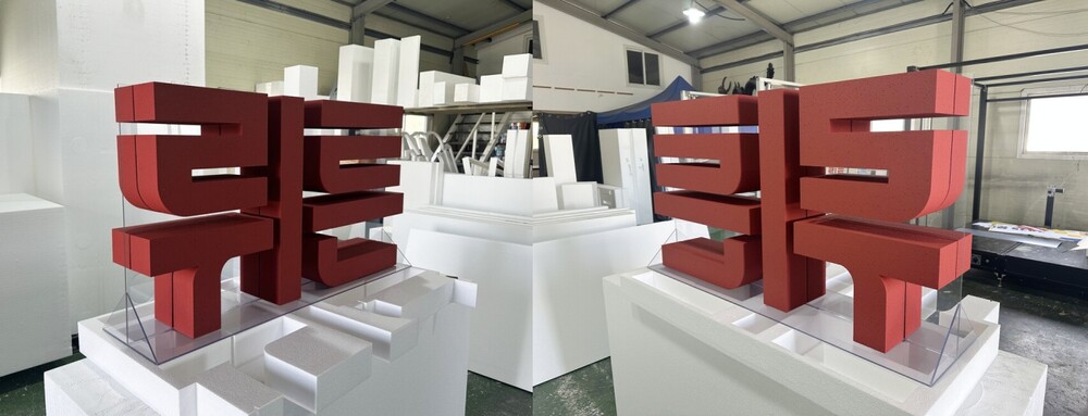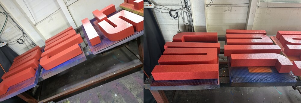 디자인 시안이 확정되면 본격적인 재단 과정이 진행됩니다. 뤼튼 글자 조형물은 컴퓨터 조각기를 이용해 정밀하게 스카시 형태로 재단되며,각 글자는 균형감과 완성도를 위해 동일한 모양으로 두 세트를 제작합니다. 이번 작업에는 일반 스티로폼이 아닌 조각용 고밀도 스티로폼을 사용했습니다. 스카시 재단이 완료된 후에는 사전에 협의한 컬러를 기준으로 도색 작업이 진행됩니다.도료는 한 번에 두껍게 칠하지 않고, 여러 번 얇게 겹쳐 올려 색이 고르게 표현되도록 했습니다.이 과정을 통해 도료가 흐르거나 뭉치지 않으며, 표면이 부드럽고 균일한 질감을 유지합니다.