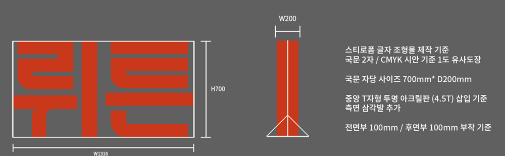 도색이 건조되는 동안에는 T자형 투명 아크릴 지지대를 제작해조형물이 별도의 받침 없이도 단독으로 설 수 있도록 구조를 보완했습니다. 완전히 건조된 스티로폼 글자 조형물은 아크릴판 전면과 후면에 정확하게 부착되어,전면에서는 단정하고 깔끔한 인상을, 측면에서는 입체감 있는 형태감을 전달합니다. 또한 조형물이 한글 형태이거나 2단 구조로 제작되는 경우,글자 간 간격을 일정하게 유지하기 위해 아크릴판이 필수적으로 사용됩니다.