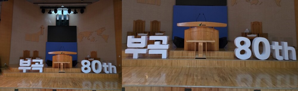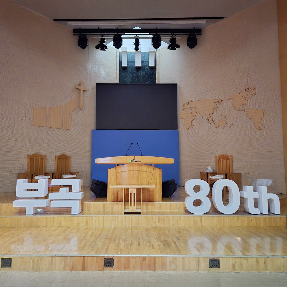 부곡감리교회 창립 80주년 기념 부흥회 현장에는 ‘부곡 80th’ 문구를 담은 스티로폼 스카시가 무대 위에 설치되었습니다.