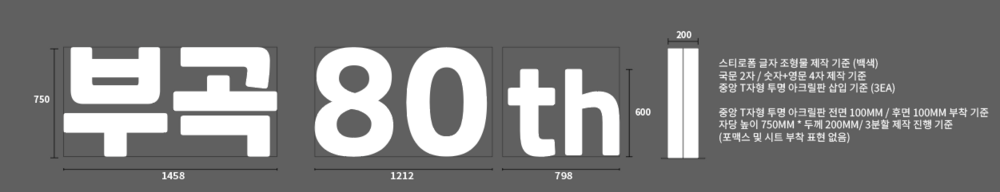 부곡감리교회 창립 80주년 기념 부흥회를 위해 제작된 스티로폼 스카시는 1단 구성으로 전체 길이 3468mm, 글자 높이 750mm로 디자인되었습니다. 행사 무대의 크기와 비율을 고려해 시인성이 높도록 설계되었으며, 조형물의 안정성을 확보하기 위해 중앙부에는 T자형 아크릴 지지대를 삽입했습니다. 디자인 시안은 현장 무대와 자연스럽게 조화를 이루면서도, 기념행사의 상징성을 돋보이며 전체적인 분위기를 방해하지 않는 방향으로 제작이 진행되었습니다.