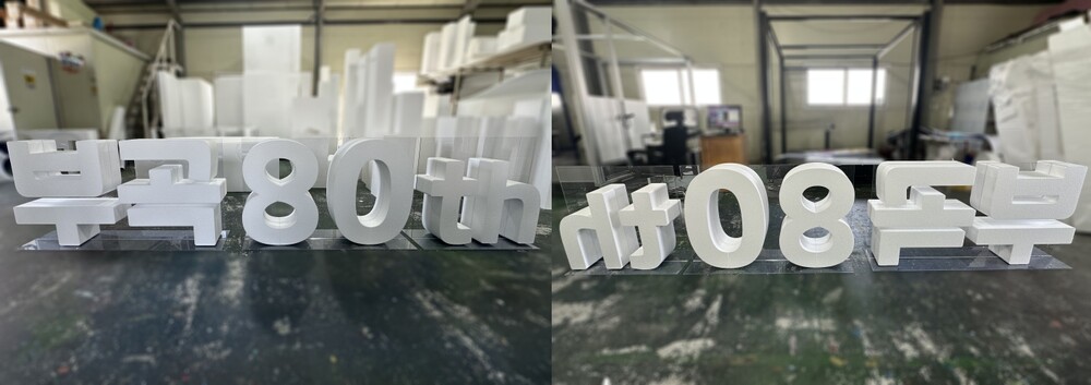 디자인 시안 확정 후에는 컴퓨터 조각기를 이용해 각 글자의 높이 750mm, 전체 길이 3468mm에 맞춰 스티로폼을 정밀하게 재단하였습니다. 재단 과정에서는 글자의 형태가 변형되지 않도록 충분한 두께를 확보하고, 열에 의한 손상을 방지하기 위해 적정 온도와 속도로 절단 작업을 진행했습니다. 완성된 스티로폼 글자들은 무대 설치 구조에 맞춰 중앙의 T자형 투명 아크릴 지지대를 중심으로 앞뒤 위치를 정확히 맞추어 부착하였습니다.