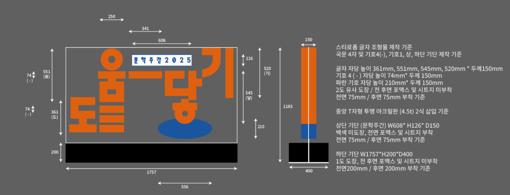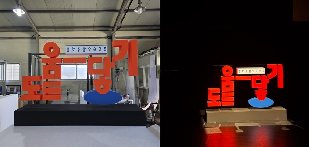 한국문화예술위원회에서 주최하고 문화체육관광부에서 후원한 ‘문학주간 2025 도움닿기’ 무대 소품용 스티로폼 스카시 조형물은 전달해 주신 로고 디자인을 기반으로 시안 작업이 진행되었습니다. 별도의 디자인 파일이 없는 경우에도 걱정하지 않으셔도 됩니다. 행사의 콘셉트, 무대 분위기, 설치 위치, 사용 기간, 색상 등의 정보를 공유해 주시면,이에 맞춰 맞춤형 시안을 1:1로 제안해드리고 있습니다.