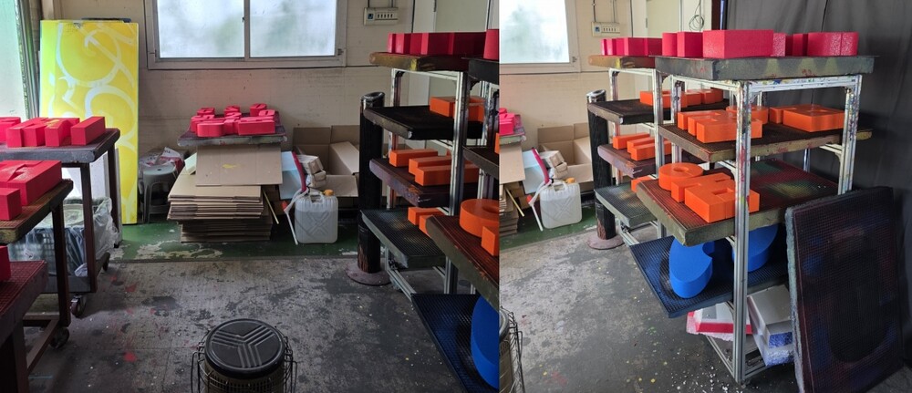 클라이언트 맞춤형 디자인 시안을 기반으로 재단 작업이 진행됩니다. 이번 공연장 홍보 포토존 국문 글자 스티로폼 조형물은 밀도가 높은 조각용 스티로폼으로 컴퓨터 조각기를 활용해 동일한 크기와 형태로 정밀 재단되며, 내부 공간이 있는 글자(예: ㅇ, ㅁ)는 포맥스와 시트지 부착으로 매끄럽게 처리됩니다. 재단 후 시안에 맞춰 프리미엄 자동차 도료로 도색하고, 충분히 건조한 뒤 투명 아크릴판을 중심으로 앞·뒷면을 정확히 부착해 완성합니다.